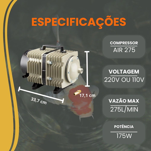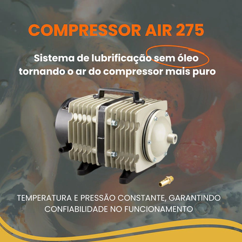 o O Compressor Air 275 é usado em aquicultura, fornecimento de oxigênio para alimentos vivos em restaurantes, para tanques de alimentação de peixe e uma série de outras aplicações. O Cubo Air 275, com vazões respectivas de 275 litros por minuto de ar. Utilizado também em máquinas que necessitam ar em seu funcionamento, instrumentos médicos, sprays de pintura, etc. Usado em tratamento de água, fornecimento de ar para aquários e lagos, máquinas, limpeza de peças, equipamentos médicos, manufatura entre outras.