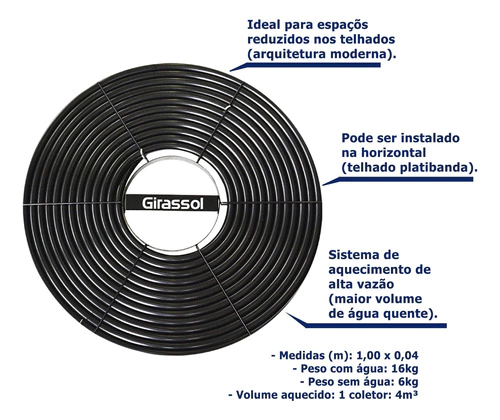 O Coletor solar Girassol G1 possui um exclusivo modelo estrutural. É fabricado na forma espiral/circular, com tubos de fabricação própria de polímero especial com proteção contra raios UV. O suporte de fixação foi desenvolvido através de projeto da Girassol, em aço carbono e pintura eletrostática, fechado com grampos especiais.