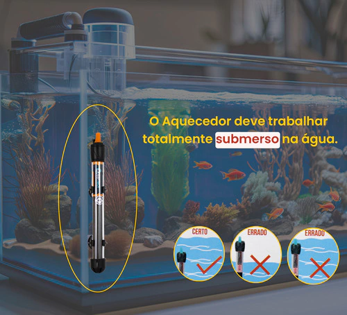 o O aquecedor deve ser colocado no aquário na posição vertical e estar totalmente submerso, nunca ligar com quaisquer parte fora da água.
