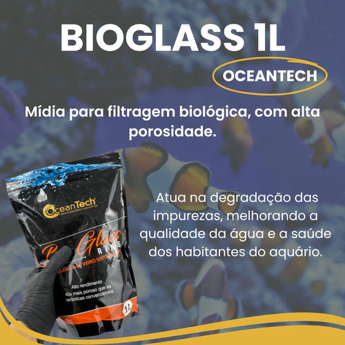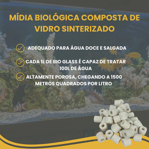 o Bio Glass atua na degradação das impurezas, melhorando a qualidade da água e a saúde dos habitantes do aquário. Com tamanho e formato especial, as mídias asseguram um excelente fluxo e distribuição da água em filtros ou sumps.