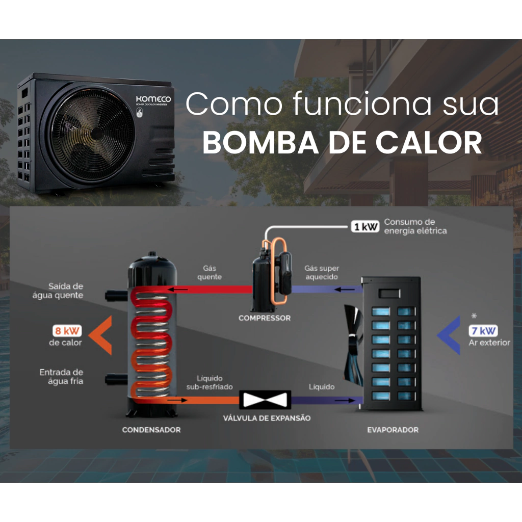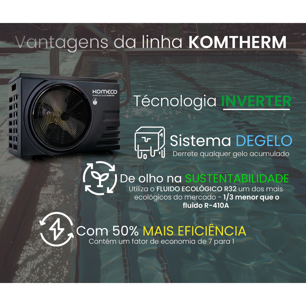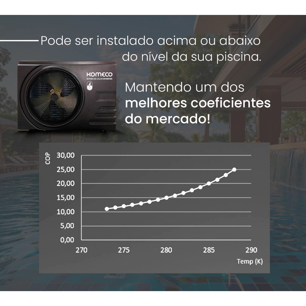 o Sistema de aquecimento inovador que mantém sua água aquecida por quanto tempo desejar, utilizando a avançada tecnologia inverter com máxima economia de energia. A bomba de calor Komtherm da Komeco é perfeita para TODOS OS TIPOS DE PISCINA, com um sistema de controle personalizado e inteligente de aquecimento.