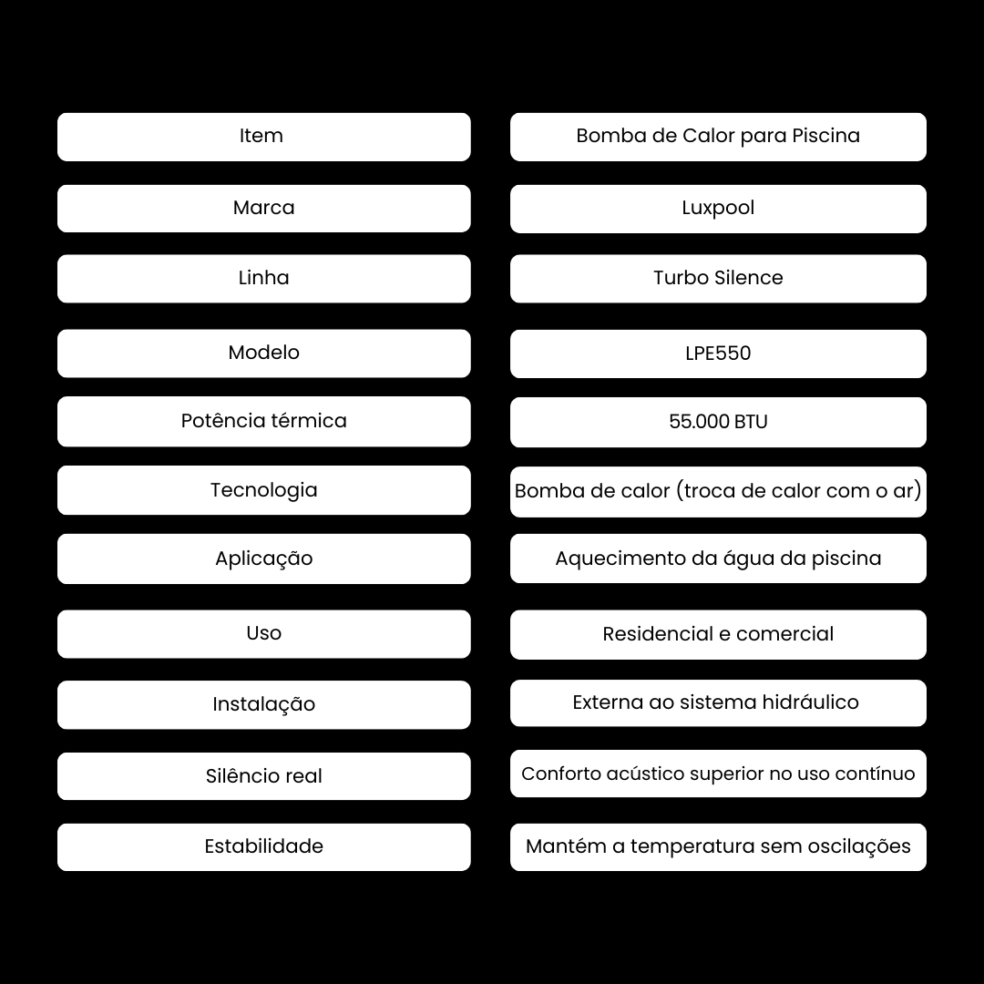 A Bomba de Calor Turbo Silence Luxpool LPE550 55.000 BTU é indicada para o aquecimento eficiente da água da piscina, proporcionando conforto térmico com alto desempenho e baixo consumo de energia. Utilizando tecnologia de bomba de calor, o equipamento aproveita o calor do ar ambiente para aquecer a água de forma econômica e sustentável.