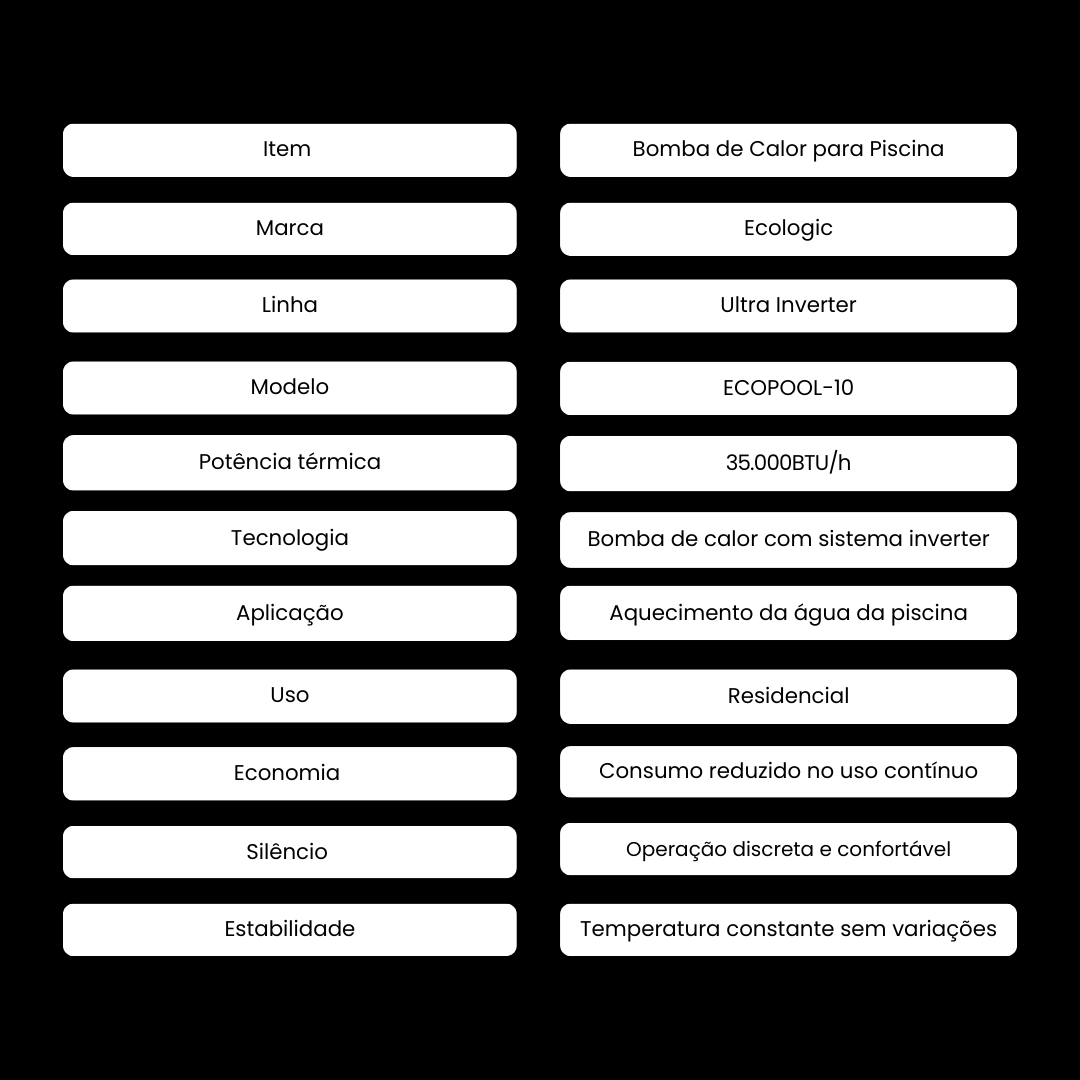 A Bomba de Calor Ultra Inverter Ecologic ECOPOOL-10 35.000 BTU/h foi desenvolvida para quem busca alto desempenho no aquecimento da piscina aliado à máxima economia de energia. Utilizando tecnologia inverter de última geração, o equipamento aproveita o calor do ar ambiente para aquecer a água de forma eficiente, silenciosa e sustentável.