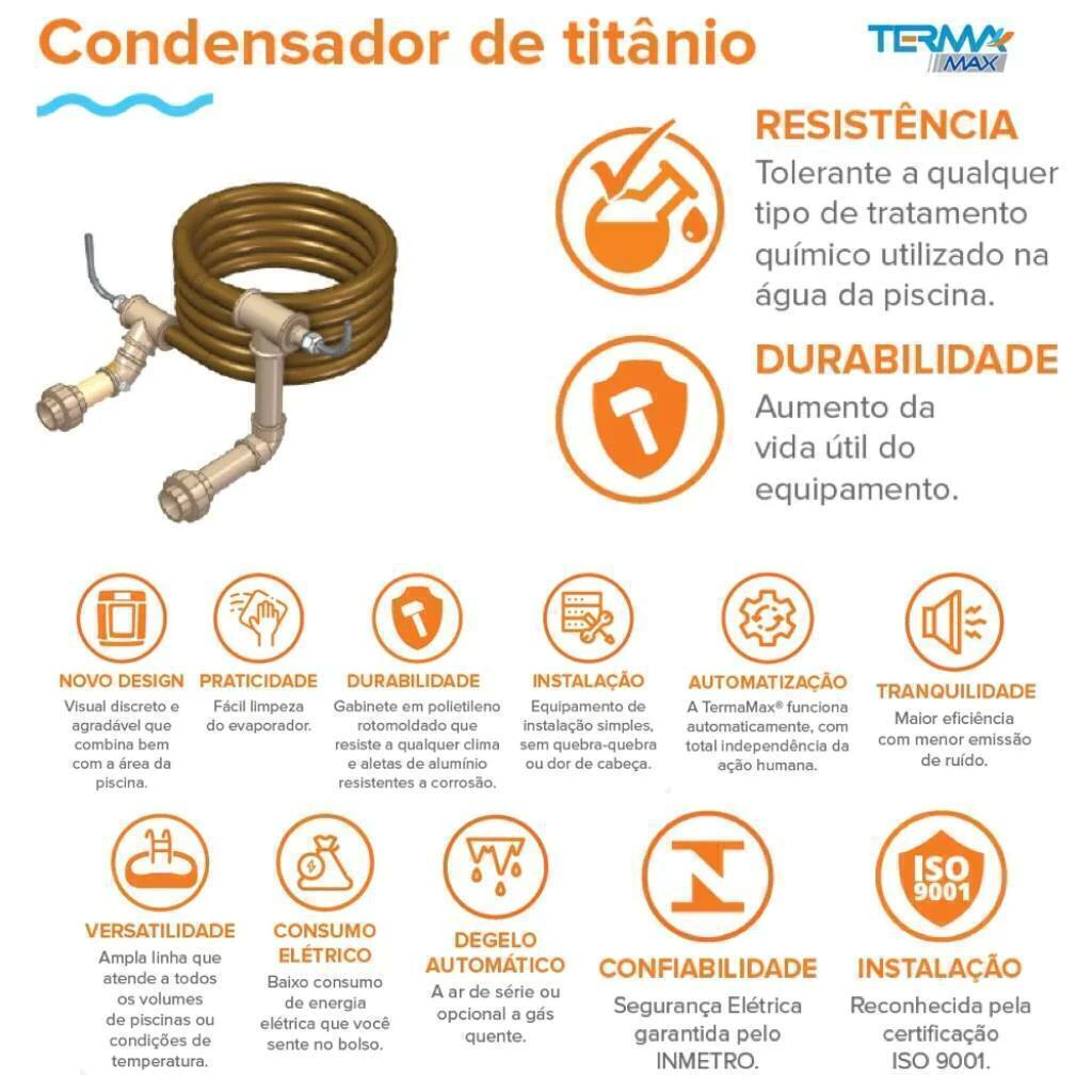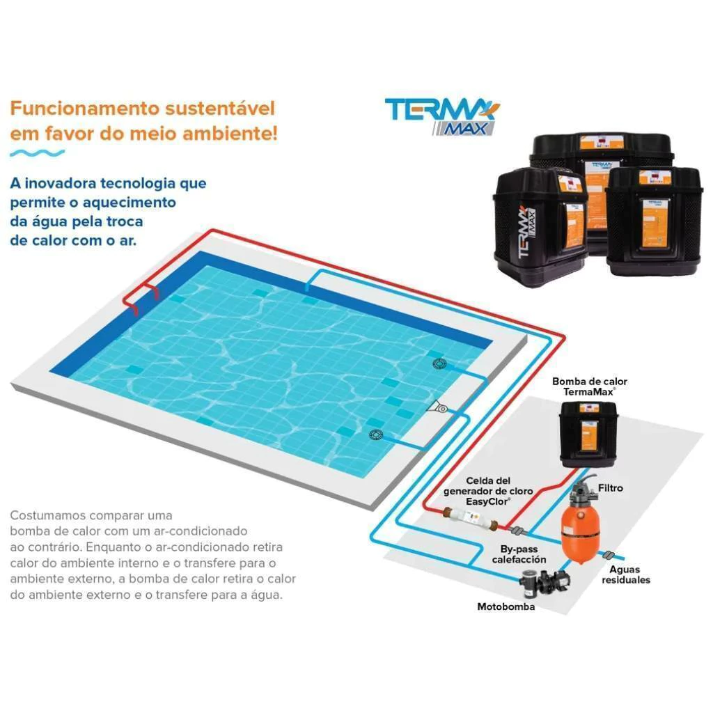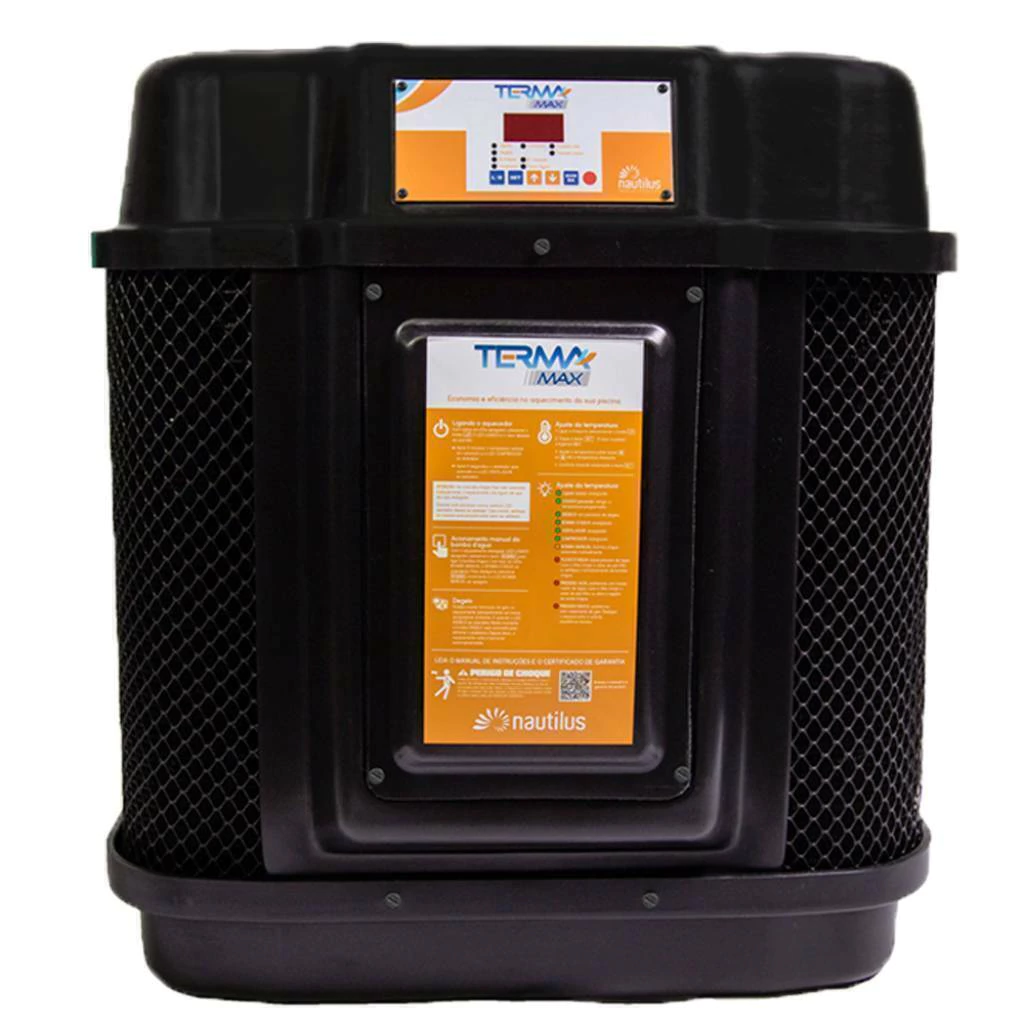 • TermaMax® 3 é monofásico, com tensão 220 V, conta com ventilador de baixo nível de ruídos, sistema de degelo a ar de série, é de fácil instalação e operação. Seu painel digital tem sinalização de falhas protegendo o equipamento de danos. Pode ser instalado em conjunto com qualquer tipo de tratamento químico da água (gerador de cloro, ozonizador etc.), sem acarretar na perda da garantia.