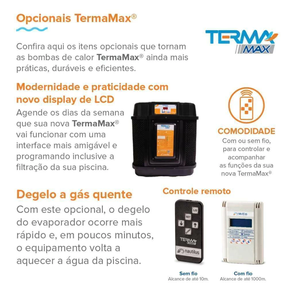 • Além disso, a Bomba de calor Nautilus TermaMax® é sinônimo de segurança, pois possui condensador de titânio que é resistente e isolado eletricamente e não permite a passagem de corrente elétrica para a água. Como opcionais, o produto oferece o sistema de comando a distância (sem fio até 10m, com fio até 1000m) e display LCD com calendarização para o aquecimento e automatização da filtração.