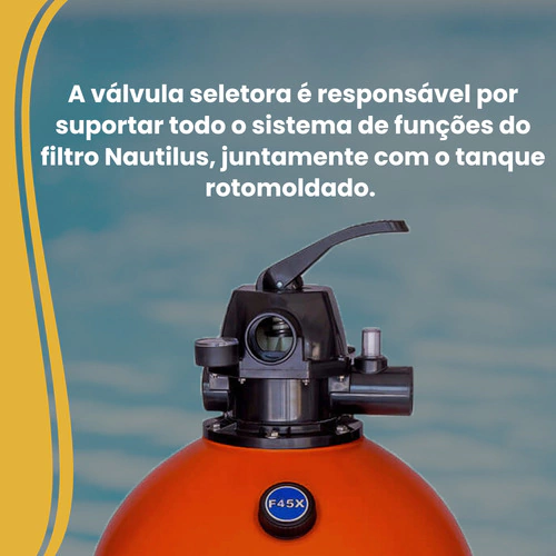 o A válvula seletora é responsável por suportar todo o sistema de funções do filtro Nautilus, juntamente com o tanque rotomoldado. Caso tenha algum tipo de vazamento nessa conjuntura pode consecutivamente danificar todo o seu sistema hidráulico e maquinários em sua sala de máquinas da piscina pois a água que vaza contém cloro e é altamente corrosivo. Por isso tem que estar em ordem para uma melhor qualidade da sua água e sistema em geral.