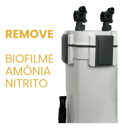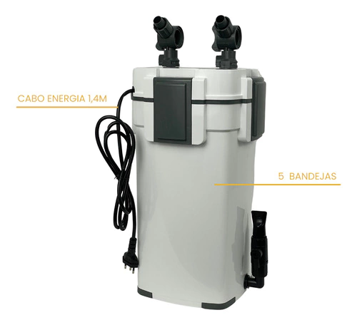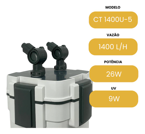 o O Canister CT 1400U-5 é um filtro silencioso e potente que filtra e remove o biofilme na superfície, elimina Amônia e Nitrito por processos biológicos e possui esterilizador ultravioleta (UV) integrado ajustável com alta tecnologia.