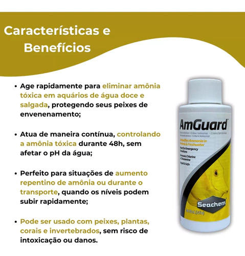 o É seguro para uso durante o pleno funcionamento do aquário e é ideal para o tratamento de situações de emergência. AmGuard é o removedor de amônia mais forte no mercado. Funciona em poucos minutos para desintoxicar a amônia livre e não degrada mesmo quarenta e oito horas depois. Isso é quase duas vezes a capacidade dos produtos dos concorrentes.