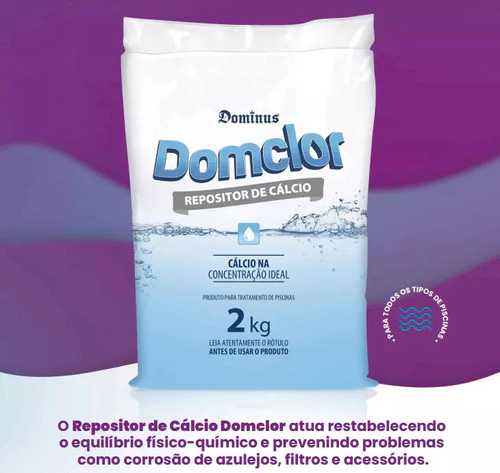 o O Repositor de Cálcio Domclor restabelece o equilíbrio físico-químico da água, prevenindo problemas como corrosão de azulejos, filtros e acessórios. Para aumentar a dureza cálcica em 10 ppm, adicione 15 gramas do produto para cada 1.000 litros de água da piscina. Dissolva o repositor na própria água da piscina e espalhe sobre a superfície com a filtração em funcionamento. Mantenha a filtração ou recirculação por 30 a 60 minutos para homogeneizar a solução e só permita o uso da piscina 30 minutos após a aplicação.