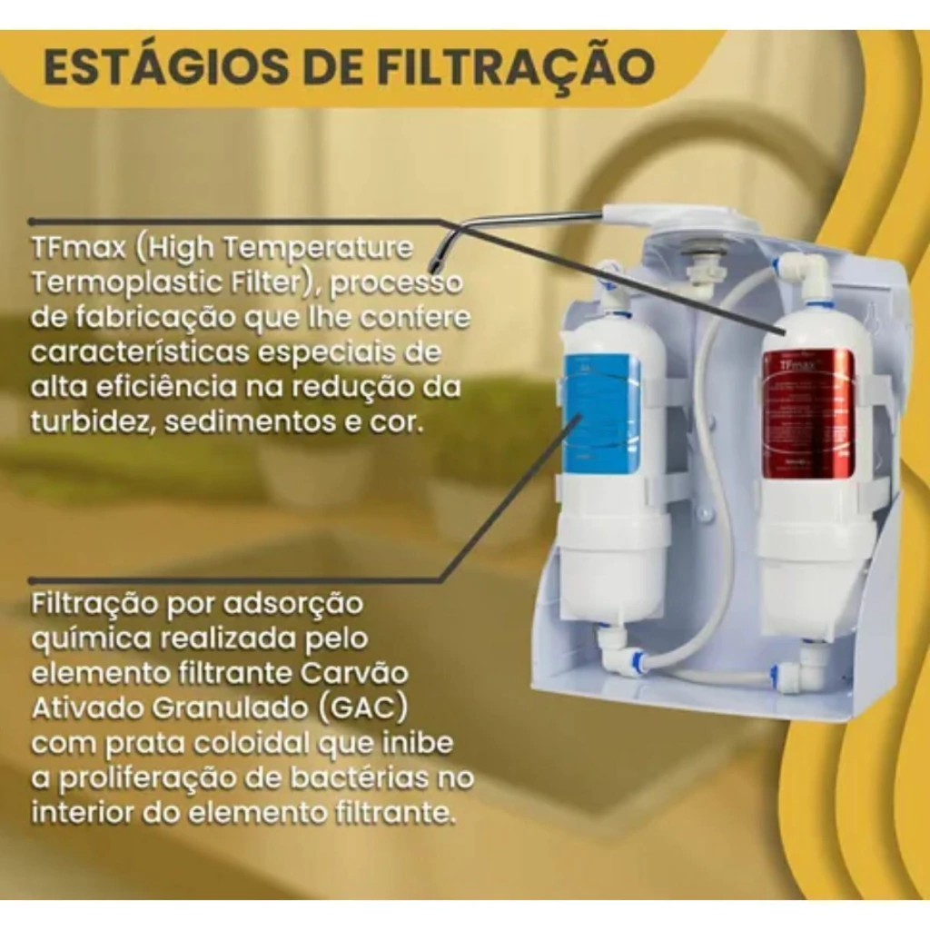 - Segundo estágio: Filtração por adsorção química realizada pelo elemento filtrante Carvão Ativado Granulado (GAC) com prata coloidal que inibe a proliferação de bactérias no interior do elemento filtrante.