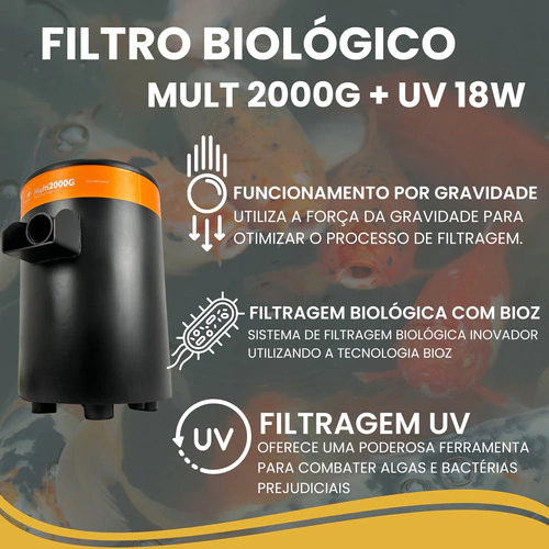 o Filtragem biológica com BioZ: O filtro Multi G conta com um sistema de filtragem biológica inovador utilizando a tecnologia BioZ, promovendo o desenvolvimento de uma colônia de microrganismos benéficos que ajudam a manter o equilíbrio biológico do seu lago.