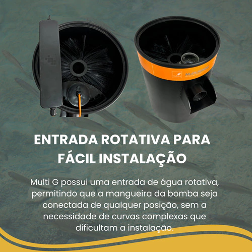 o Entrada rotativa para fácil instalação: Pensando na sua comodidade, o Multi G possui uma entrada de água rotativa, permitindo que a mangueira da bomba seja conectada de qualquer posição, sem a necessidade de curvas complexas que dificultam a instalação.
