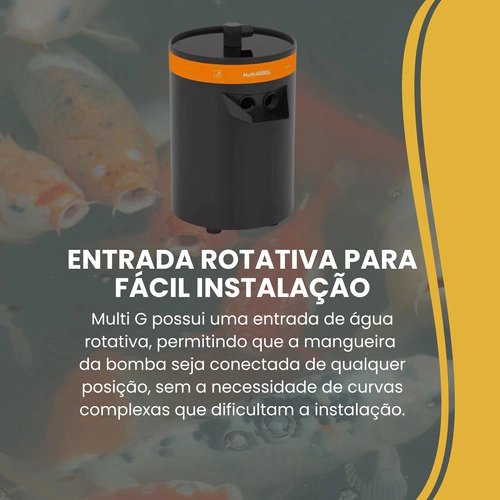 o Entrada rotativa para fácil instalação: Pensando na sua comodidade, o Multi G possui uma entrada de água rotativa, permitindo que a mangueira da bomba seja conectada de qualquer posição, sem a necessidade de curvas complexas que dificultam a instalação.