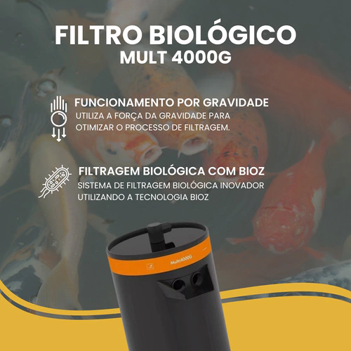 o Filtragem biológica com BioZ: O filtro Multi G conta com um sistema de filtragem biológica inovador utilizando a tecnologia BioZ, promovendo o desenvolvimento de uma colônia de microrganismos benéficos que ajudam a manter o equilíbrio biológico do seu lago.