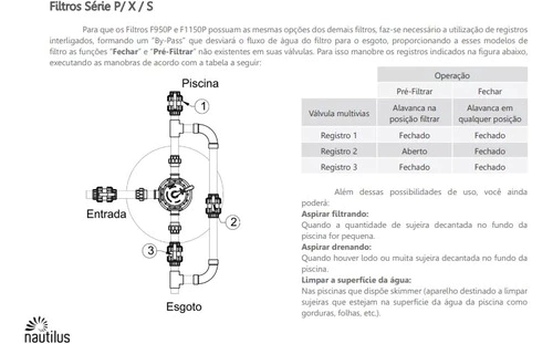 É compatível com as motobombas Nautilus série NBF-5 / NBFC-5 (1.5 cv). Seu manuseio é simples e seguro através da válvula seletora multivias em ABS com 6 (seis) posições (filtrar, lavar, drenar, recircular, pré-filtrar e fechado).
