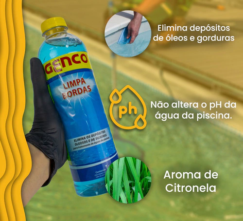 O LIMPA-BORDAS GENCO® é uma acordo detergente biodegradável, de baixa espuma e com pH na mesma faixa das águas de piscinas, principalmente formulada para eliminar das bordas da piscina os depósitos de óleos e gorduras que normalmente servem de adesivo para as sujeiras flutuantes além de abrigo e/ou alimento para toda espécie de microorganismos.