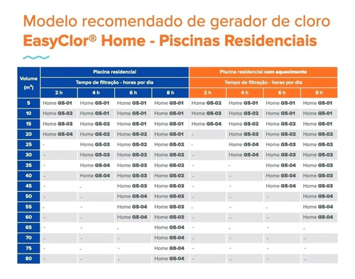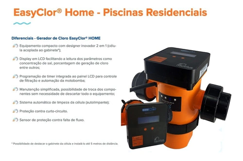 O Gerador de Cloro EASYCLOR HOME funciona em conjunto com a filtração e produz cloro de forma automatizada, a partir do sal, por meio de um processo de eletrólise. O EASYCLOR HOME deve ser instalado na tubulação de retorno do filtro, o qual poderá trabalhar nas condições de filtrar ou recircular (conforme recomendação diária). Após a instalação do equipamento, basta adicionar sal (sal especial para piscina) para ter uma piscina clorada automaticamente sem complicações