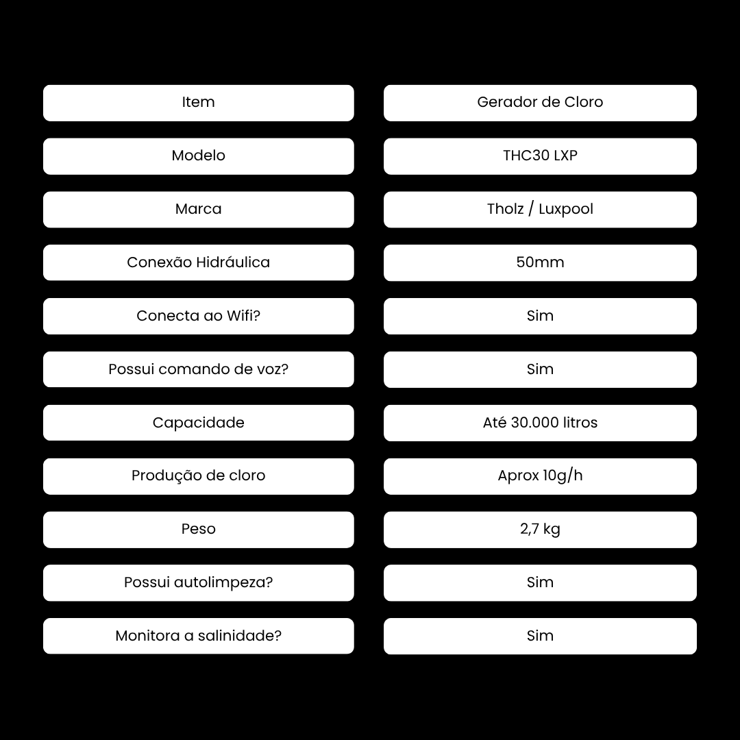 Com design compacto, alta durabilidade e tecnologia de ponta, o THC30 LXP oferece monitoramento inteligente, autolimpeza da célula e conectividade via Wi-Fi, permitindo controle completo através do aplicativo Tholz Casa Inteligente.