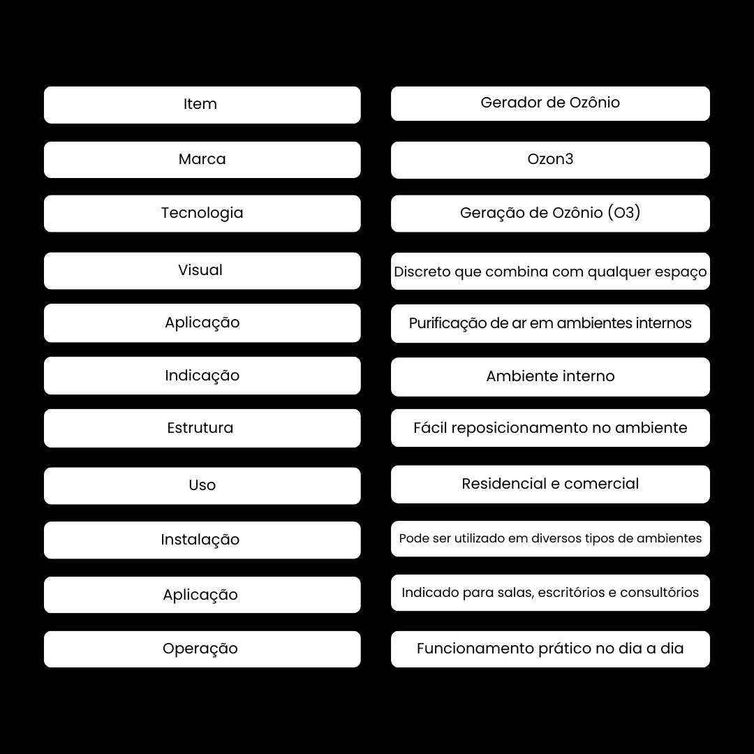 O Gerador de Ozônio Air Slim Ozon3 é um equipamento compacto, moderno e eficiente para purificação do ar em ambientes internos. Utilizando a tecnologia do ozônio (O3), ele auxilia na eliminação de odores desagradáveis, bactérias e micro-organismos presentes no ambiente, promovendo mais qualidade e sensação de ar renovado.
