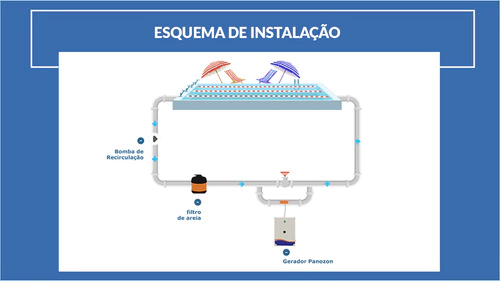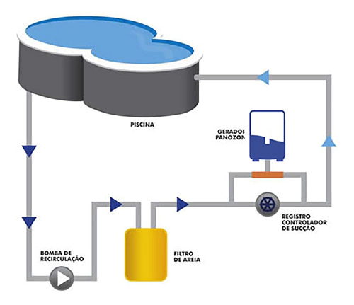 O equipamento Panozon opera em conjunto com a bomba / filtro de areia da piscina e o tempo necessário para ele ozonizar a piscina é o mesmo tempo necessário para o filtro filtrar a água.