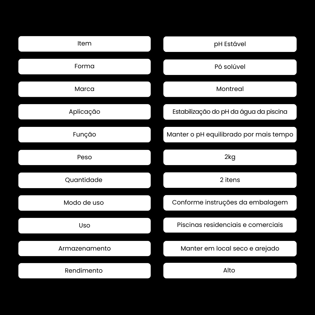 O pH Estável Montreal é um produto desenvolvido para auxiliar na manutenção do pH da água da piscina, ajudando a mantê-lo dentro da faixa ideal por mais tempo. Ele atua reduzindo as variações constantes do pH, diminuindo a necessidade de correções frequentes com pH+ ou pH-, garantindo maior estabilidade no tratamento da água.