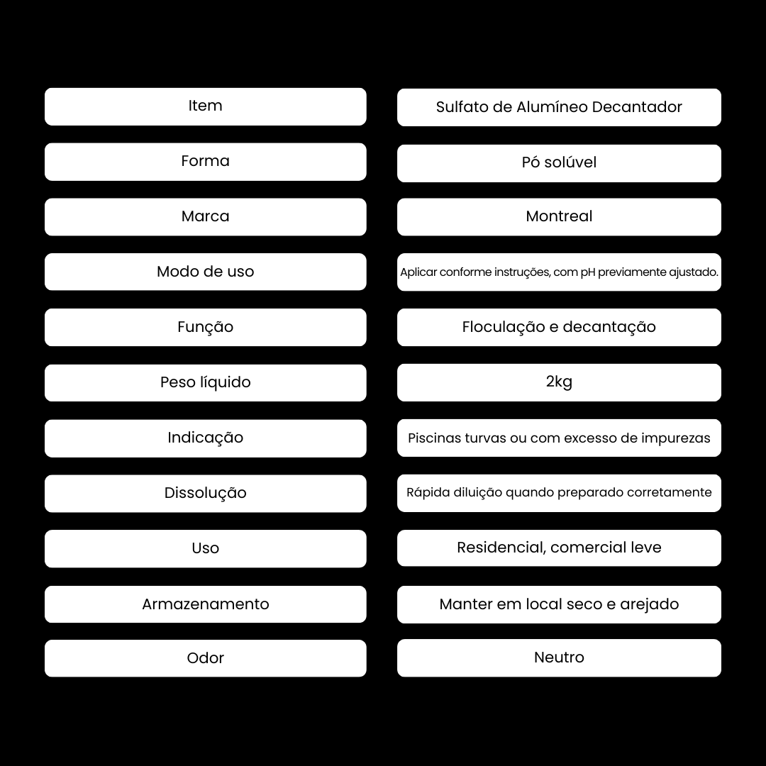 • Indicação: piscinas turvas ou com excesso de impurezas