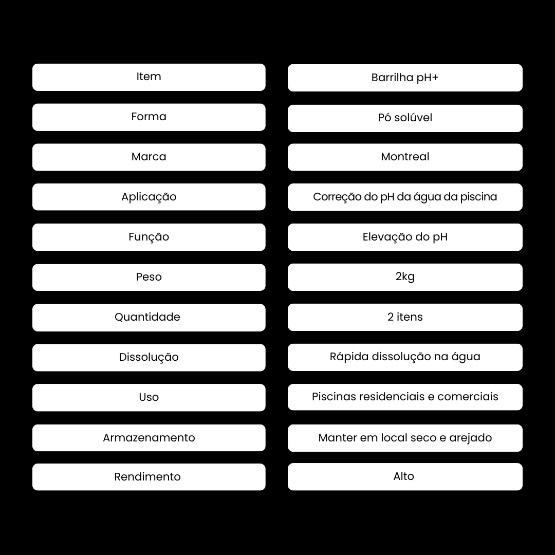 Este anúncio refere-se ao kit com 2 unidades de 2kg cada, oferecendo maior rendimento e excelente custo-benefício. Indicada para piscinas residenciais e comerciais, a Barrilha pH+ Montreal proporciona uma água mais equilibrada, segura e agradável para o uso diário.