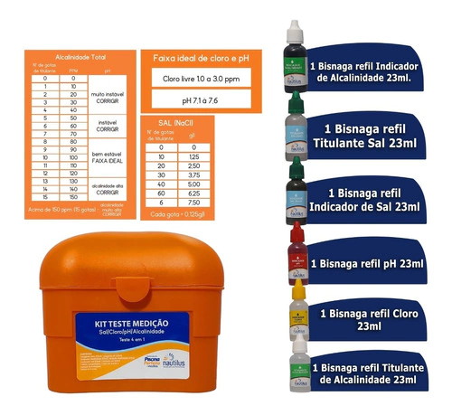 É uma caixa que contém 1 bisnaga refil para teste de pH, 1 bisnaga refil para teste de cloro, 1 bisnaga refil para teste e um titulante de alcalinidade, 1 bisnaga refil para teste e titulante de sal, um recipiente para avaliação colorimétrica da água e um medidor de pH/cloro.