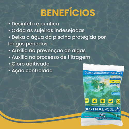 Este cloro em pastilhas é um agente desinfetante à base de cloro estabilizado de solubilidade lenta e duradoura, com uma formulação exclusiva de múltiplas ações. Além de desinfetar, este produto também realiza a oxidação da água, auxilia na prevenção de algas e melhora o processo de filtração.