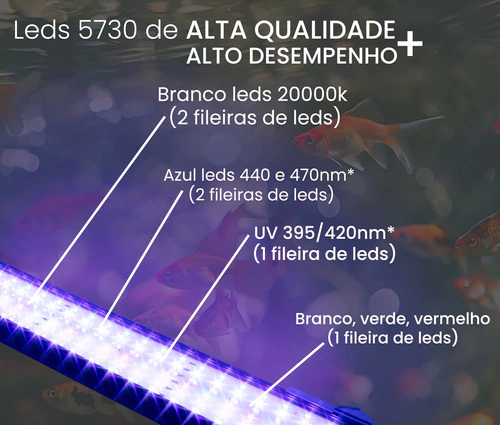 o Quantidade de Luzes: Com 210 led's 5730 de 0,5W sendo: 36 x ice white 15K | 11 x cool white 10K | 34 x ice blue 480nm | 70 x deep blue 450nm | 24 x violet 420nm | 11 x UV 395nm | 12 x green 520nm | 12 x full spectrum 400nm-800nm