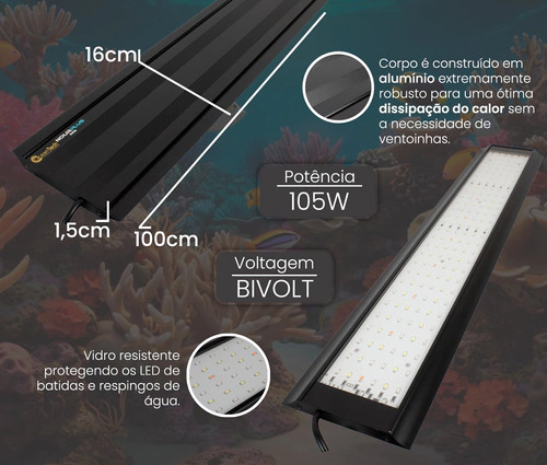 Essa luminária além de deixar seus corais e peixes muito mais bonitos e destacados, melhora a qualidade de vida do aquário. Colabora com o crescimento de plantas, corais e até na coloração dos peixes.