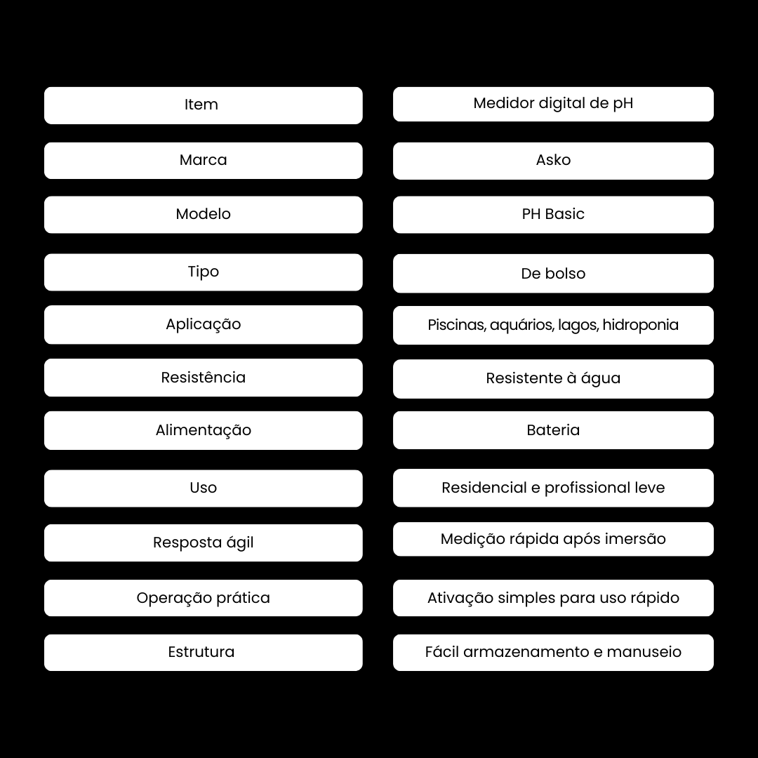 O PH Basic Akso é um medidor de pH digital de bolso, desenvolvido para medições rápidas e práticas em piscinas, aquários, lagos, hidroponia e diversas aplicações onde o controle do pH é essencial.
