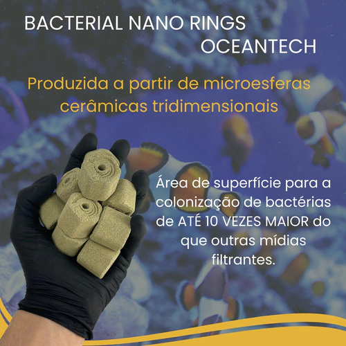 o Bacterial Nano Rings Ocean Tech é produzido a partir de microesferas cerâmicas tridimensionais, tendo assim uma área de superfície para a colonização de bactérias de até 10 vezes maior do que outras mídias filtrantes.