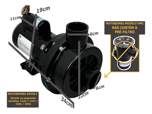 Motobomba Centrifuga HMC-3 Para Piscinas, Duchas, Cascatas e Hidromassagem 3/4cv - Com Capacitor - Bivolt (110v/220v) - Monofásico