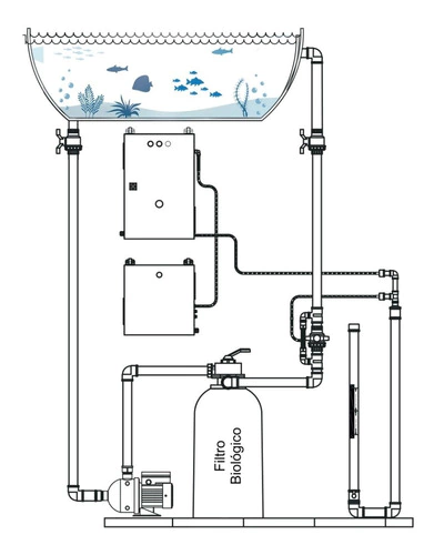 No processo de recirculação do lago, a água passa pelo filtro biológico e posteriormente o ozônio é injetado através de uma peça chamada Venturi, que injeta o gás ozônio iniciando o processo de oxidação dos contaminantes orgânicos, reduzindo a formação da amônia e eliminando também a própria amônia.