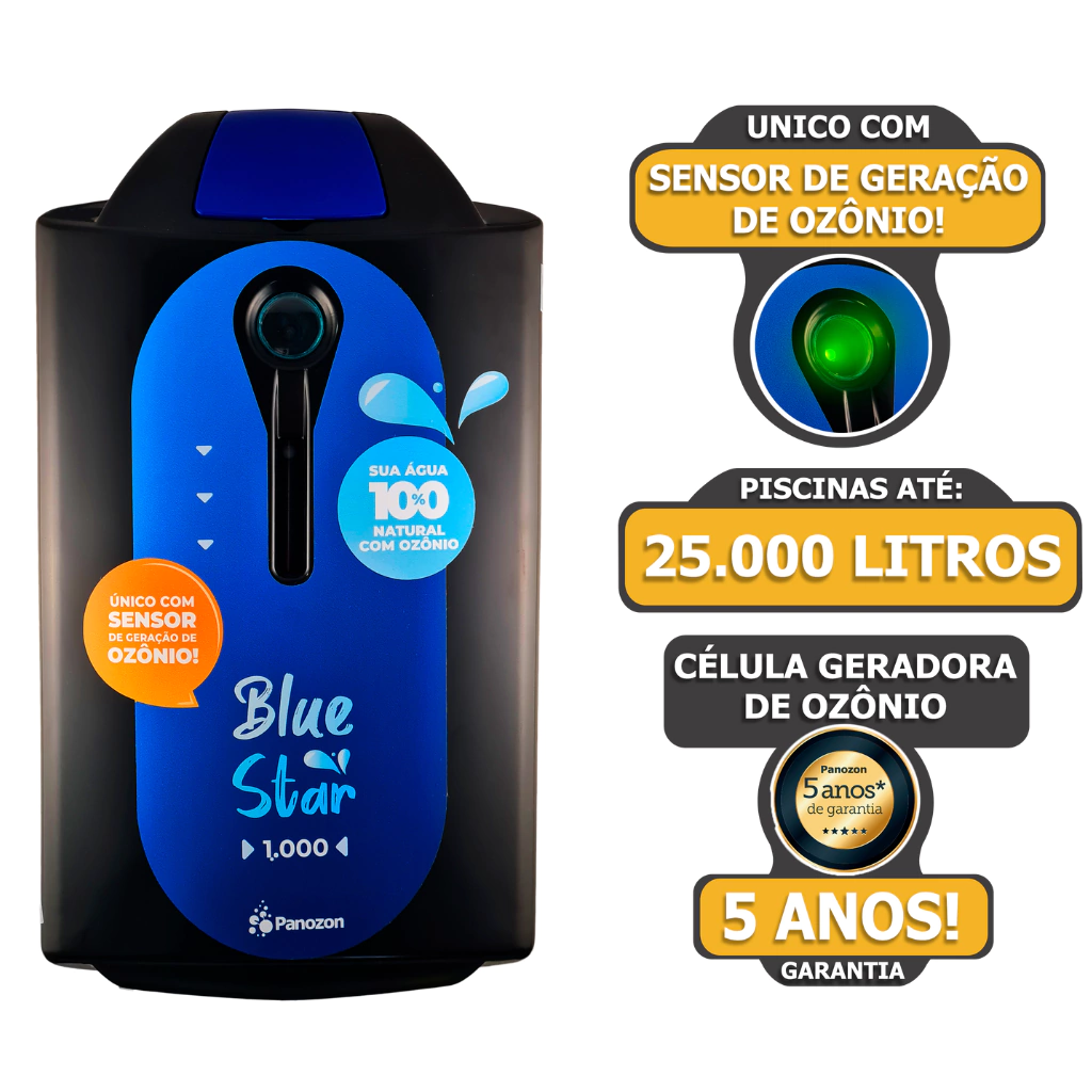o Tecnologia de Ponta: O panozon Blue Star é um sistema de tratamento de agua com ozônio para piscinas residenciais, que proporciona segurança nos momentos de lazer com agua saudável e cristalina sem os desconfortos do cloro.