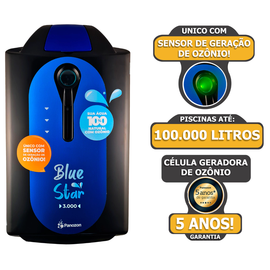 o Tecnologia de Ponta: O panozon Blue Star é um sistema de tratamento de agua com ozônio para piscinas residenciais, que proporciona segurança nos momentos de lazer com agua saudável e cristalina sem os desconfortos do cloro.