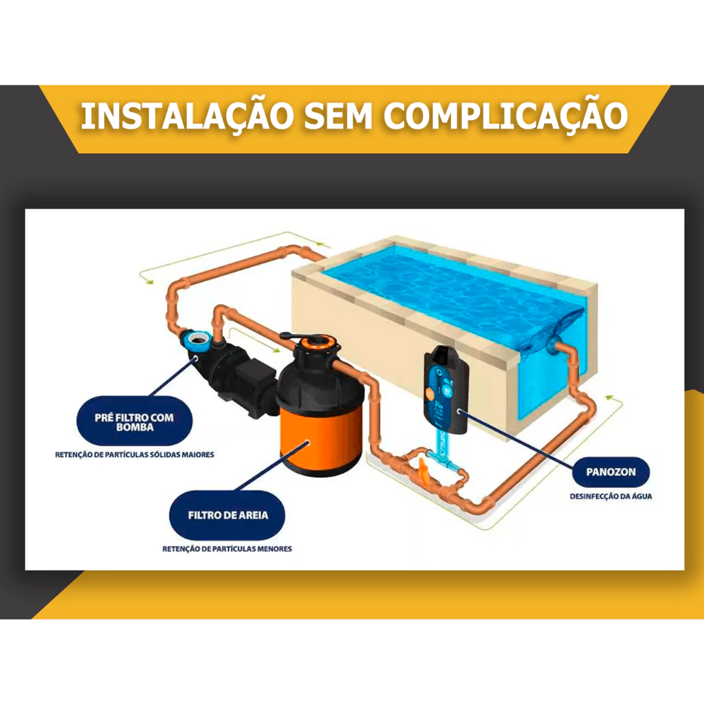 O equipamento Panozon opera em conjunto com a bomba / filtro de areia da piscina e o tempo necessário para ele ozonizar a piscina é o mesmo tempo necessário para o filtro filtrar a água.
