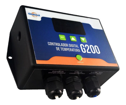 O controlador digital de temperatura G200 foi projetado para controlar sistemas de aquecimento solar para piscinas. Com ele é possível medir as temperaturas do coletor solar e da piscina e, através do diferencial das temperaturas entre eles, acionar a bomba de aquecimento de forma automática, a fim de manter a temperatura desejada da piscina.