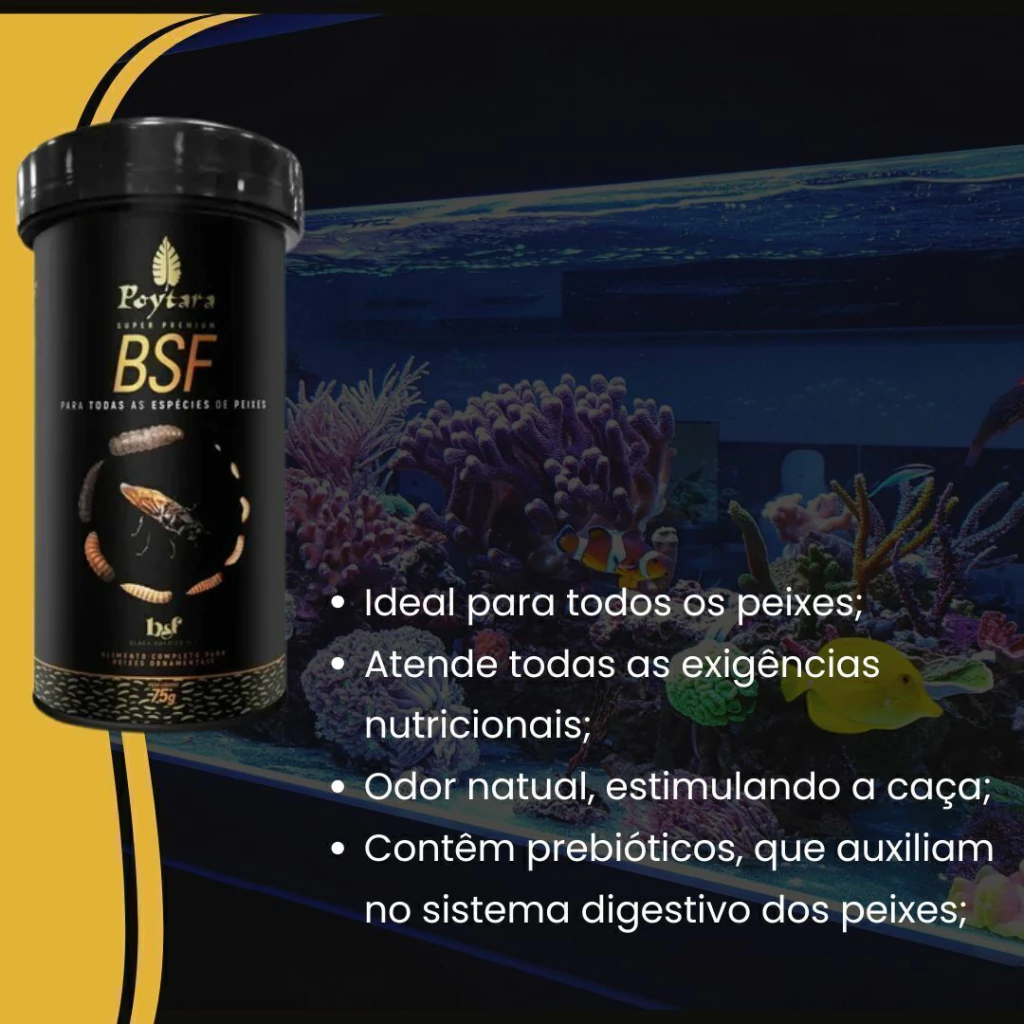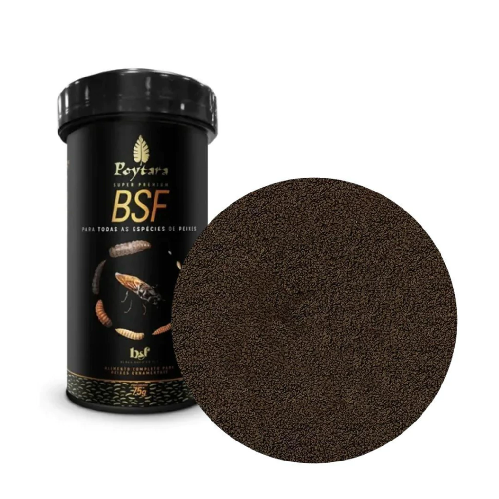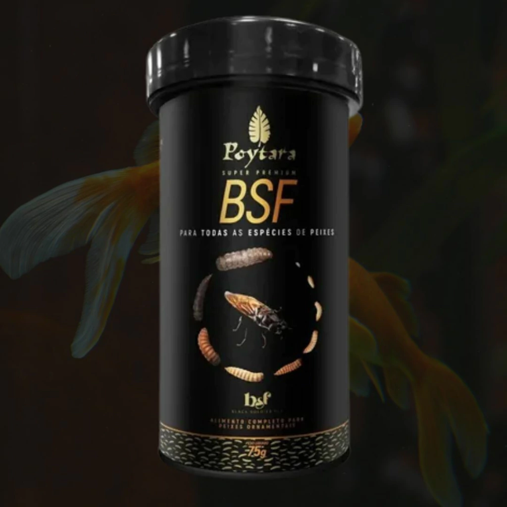 Os BSF Black Soldier Fly Crisps da Poytara são um alimento super premium em flocos (crisps), formulado com proteína sustentável da larva da mosca soldado negra (BSF). Com 50% de farinha de BSF, este alimento oferece alto valor proteico, fácil digestão e excelente aceitação por peixes de água doce e salgada, estimulando seu instinto natural de alimentação com odor característico e sem uso de corantes ou extrativismo marinho.