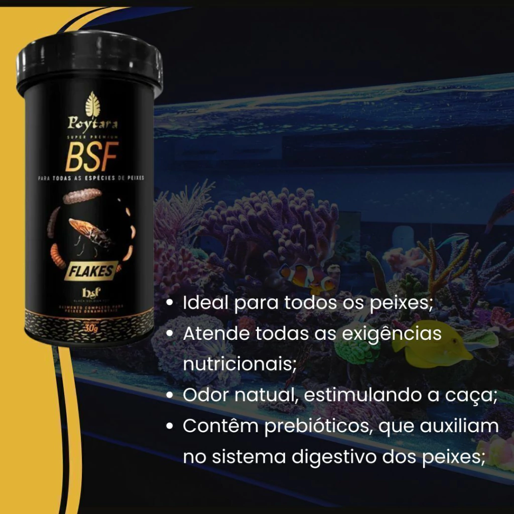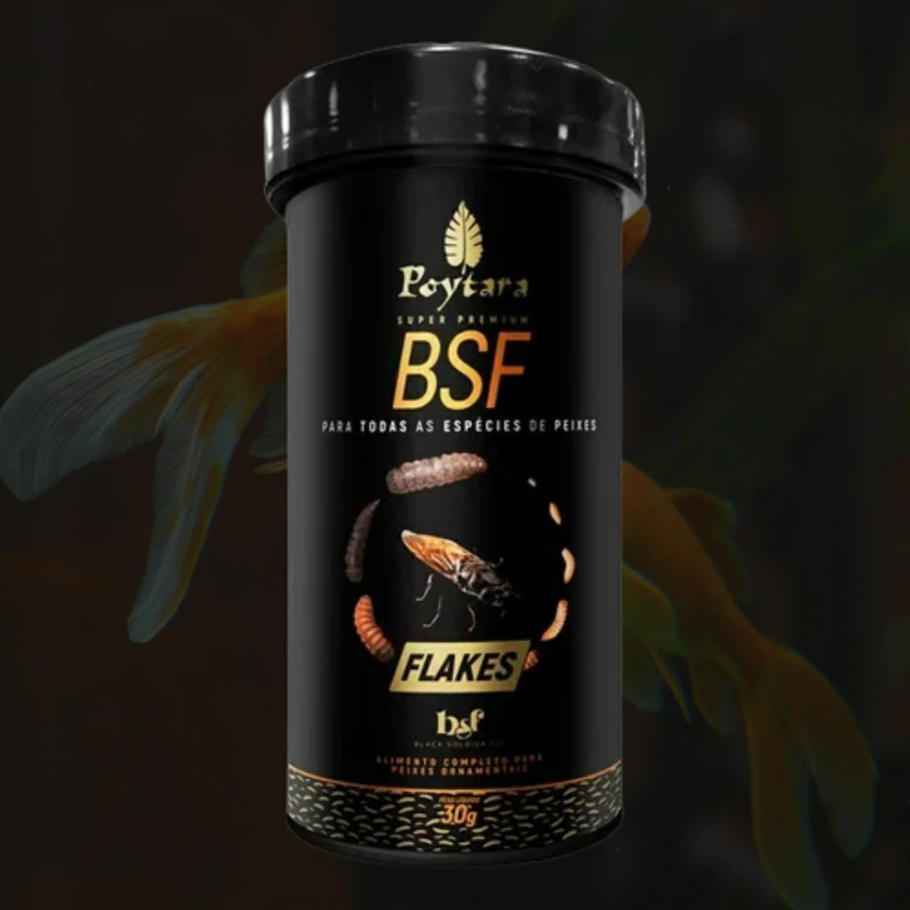 tags: poytara bsf flakes 30g, ração black soldier fly, alimento natural peixes ornamentais, flocos larva mosca soldado, ração sustentável aquário doce