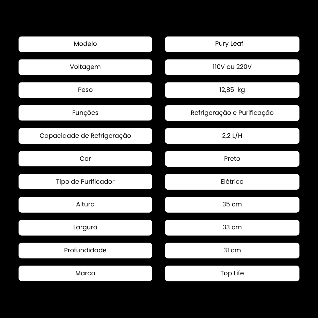 O Pury Compact Elétrico Branco com Eficiência da Top Life é um purificador de água compacto, ideal para ambientes residenciais ou comerciais com espaço restrito. Com design moderno e acabamento em preto, entrega água pura, filtrada, com praticidade e economia. Sua operação elétrica garante fluxo contínuo sem a necessidade de pressão extra, e sua eficiência permite filtragem confiável para uso diário.