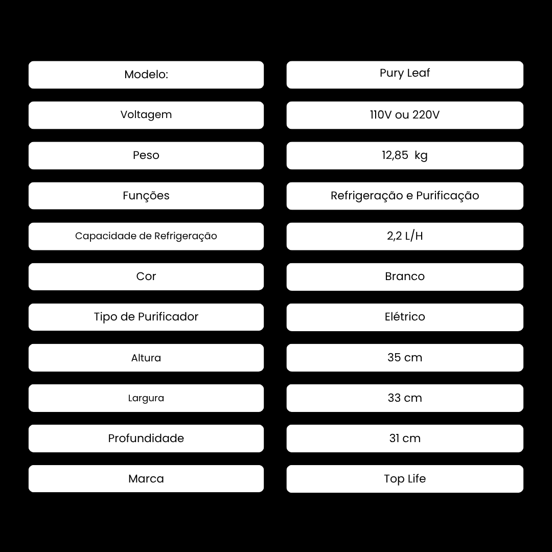 O Purificador Pury Leaf da Top Life, é a solução perfeita para quem busca saúde e praticidade no dia a dia. Desenvolvido com design moderno e compacto, ele garante água pura, fresca e de qualidade diretamente na sua torneira, eliminando impurezas, odores e sabores indesejados. Ideal para uso residencial ou em pequenos escritórios, o Pury Leaf une alta performance com economia, proporcionando hidratação segura para toda a família.