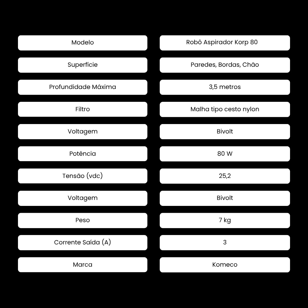 O Robô Aspirador de Piscina Komeco KORP 80 foi desenvolvido para quem quer manter a piscina sempre limpa, com o mínimo de esforço e máximo de eficiência. Ele atua no fundo, nas paredes e na linha d’água, eliminando detritos, folhas e sujeiras finas — ideal para piscinas de até aproximadamente 110 m². Equipado com escovas giratórias e sistema de filtragem de 180 µm, ele captura as menores partículas e realiza a limpeza de forma automatizada. Com programação via Wi-Fi (versão Wi-Fi disponível) e operação bivolt, é compatível com diferentes redes elétricas.