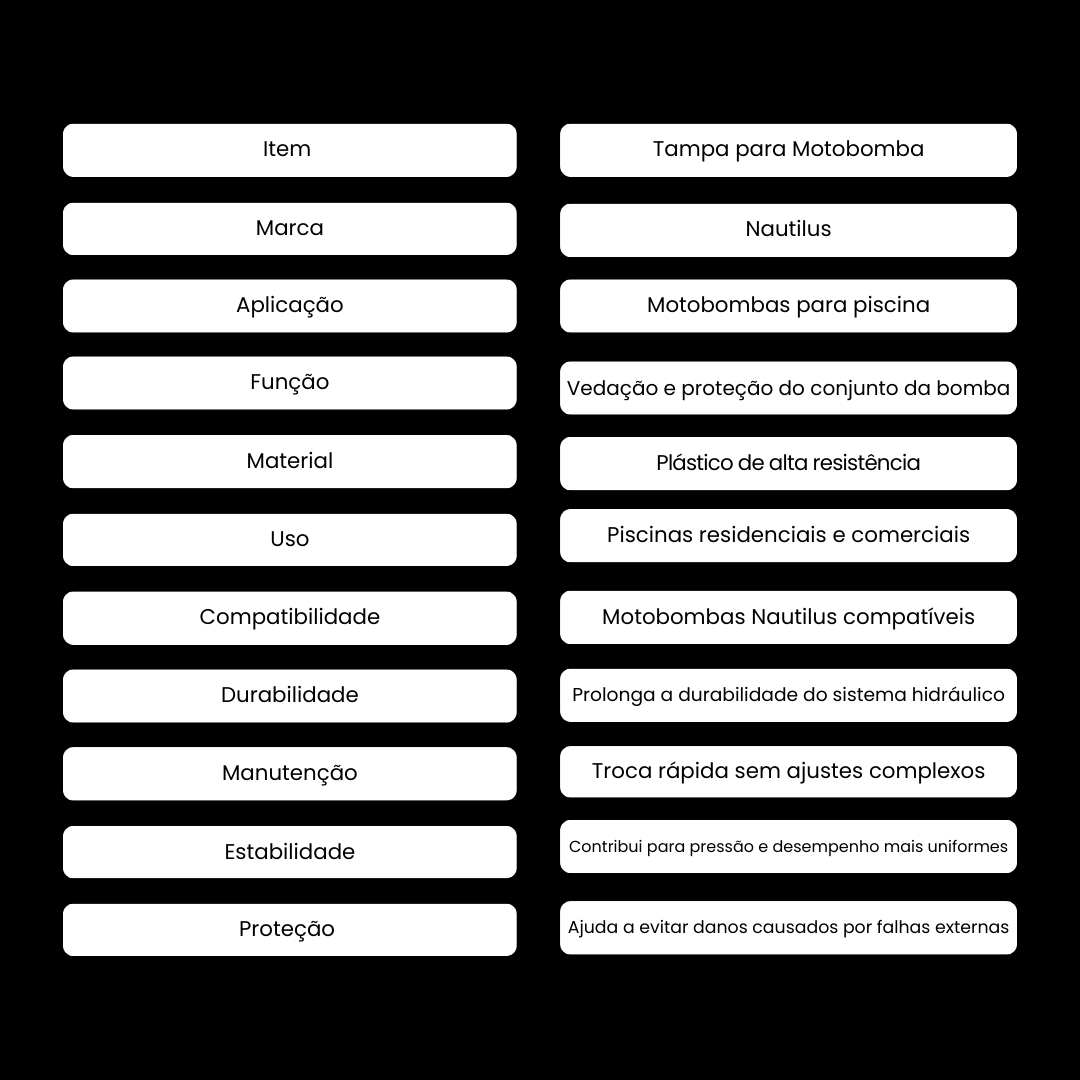 A Tampa para Motobomba Nautilus é uma peça fundamental para o correto funcionamento e a proteção do conjunto hidráulico da motobomba da piscina. Desenvolvida para reposição original, ela garante vedação adequada, proteção dos componentes internos e segurança durante a operação do equipamento.