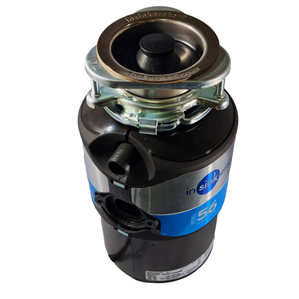 Triturador de resíduos alimentares InSinkErator modelo 56 com tecnologia de trituração de um estágio, motor de indução de alto torque e elementos de trituração em aço inoxidável.