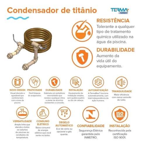 TermaMax® 8 é Trifásico, com tensão 220 V, conta com ventilador de baixo nível de ruídos, sistema de degelo a ar de série, é de fácil instalação e operação. Seu painel digital tem sinalização de falhas protegendo o equipamento de danos. Pode ser instalado em conjunto com qualquer tipo de tratamento químico da água (gerador de cloro, ozonizador etc.), sem acarretar na perda da garantia.