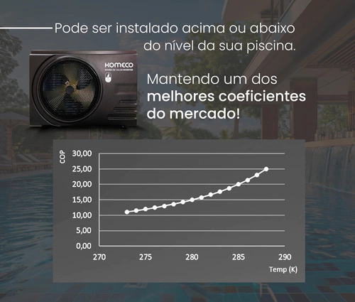 o FACILIDADE NA INSTALAÇÃO: A linha Komtherm é perfeita para quem não tem espaço no telhado para um sistema de aquecimento solar. Tantos os modelos maiores quantos os menores podem ser instalados acima ou abaixo do nível da sua piscina, mantendo um dos melhores coeficientes de performance do mercado.