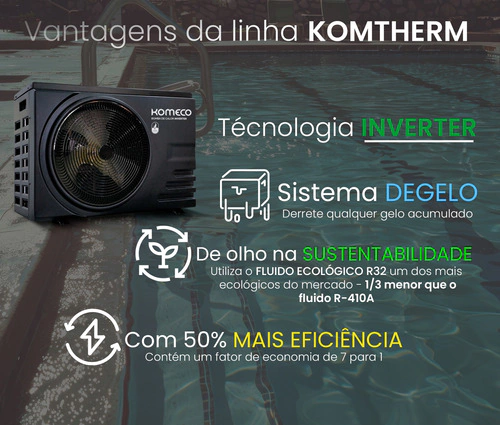 o Sistema de aquecimento inovador que mantém sua água aquecida por quanto tempo desejar, utilizando a avançada tecnologia inverter com máxima economia de energia. A bomba de calor Komtherm da Komeco é perfeita para TODOS OS TIPOS DE PISCINA, com um sistema de controle personalizado e inteligente de aquecimento.