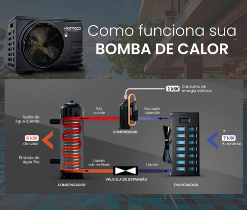 o MELHOR DESEMPENHO DO MERCADO: 50% MAIS EFICIÊNCIA do que uma bomba de calor convencional. Para cada 8kW de potência de saída, ela funciona capturando 7kW de energia do ar e consumindo apenas 1kW de energia elétrica, causando um fator de economia de 7 para 1.
